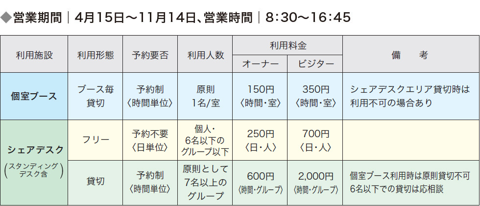 シェアデスク│貸切および冬季間の利用予約は1ケ月前から可能