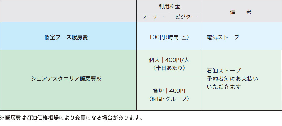 ●冬期にラウンジをご利用の場合はワークラボに準じた暖房費がかかります。